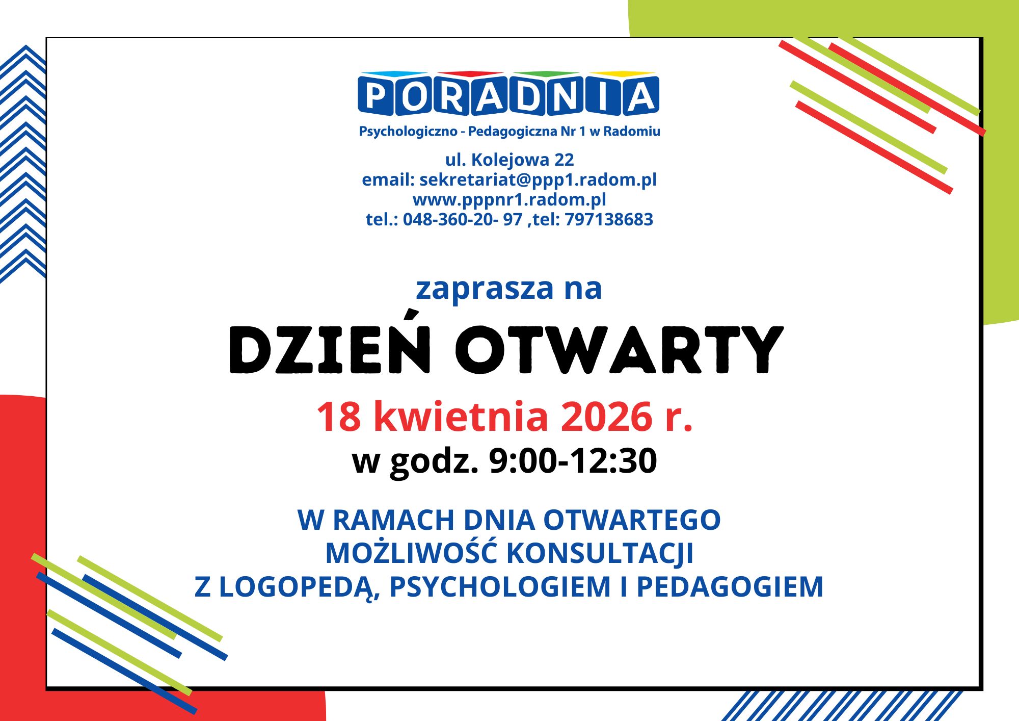 Zapraszamy na Dzień Otwarty w Poradni Psychologiczno-Pedagogicznej nr 1 (ul. Kolejowa 22).